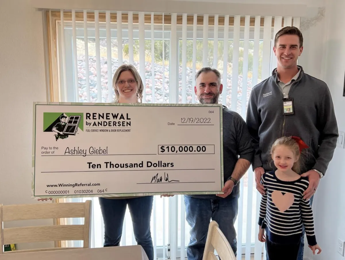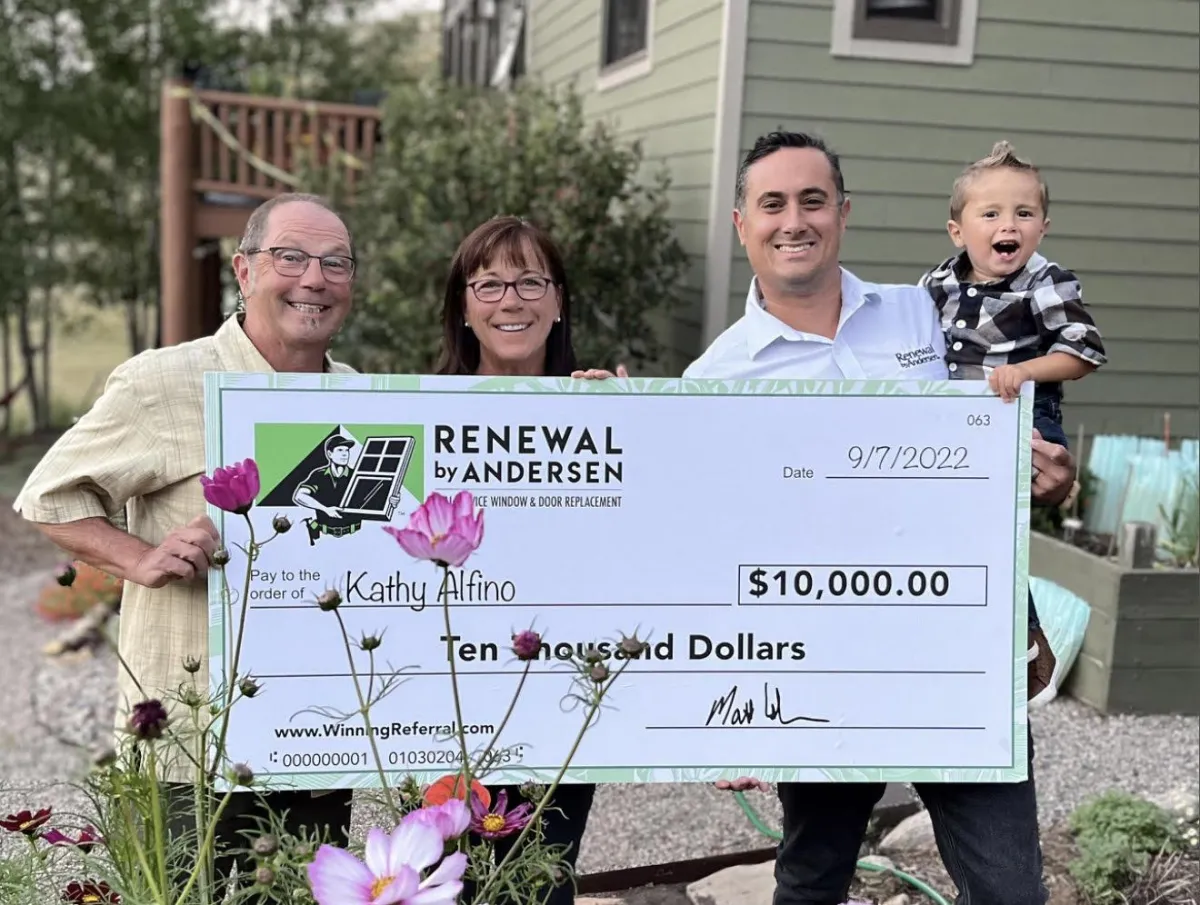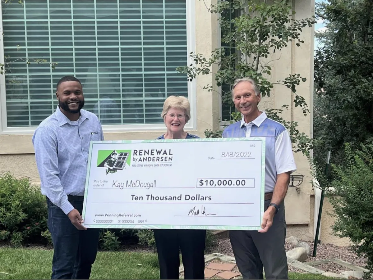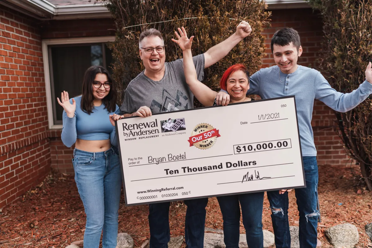 For every referral of yours who becomes a customer of Renewal by Andersen of Colorado, we will put your name into a drawing. For every 100 qualified referrals received, we will draw one person's name at random who has referred us and that person will win $10,000! In short, for every referral who buys from us, you have a 1% chance at winning the $10,000 prize pool.